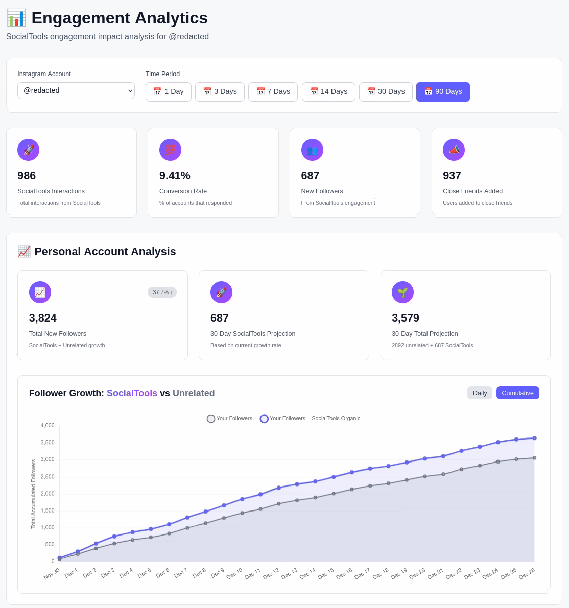 Runs 24/7 in the background. Track new followers and engagement from your dashboard.