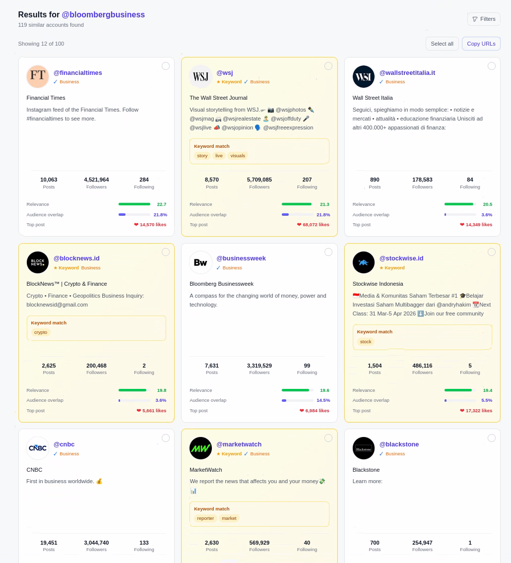 See a ranked list of overlapping accounts with relevance scores, follower counts, and filtering.